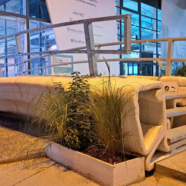 A pedestrian bridge was exhibited at the Bauma 2022 Expedition. It was designed, developed and manufactured by Witteveen+Bos and Concrefy. This innovative bridge consists of a footbridge supported by two 3D concrete printed beams with constantly changing cross-sections. This project is a perfect example of the design freedom and the integrated and fast production process made possible by 3D concrete printing.