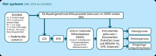 In the Netherlands, an assessment method (‘Bepalingsmethode Milieuprestatie Gebouwen en GWW-werken’) sets out the rules and agreements for determining the environmental performance of buildings and civil engineering works using the LCA methodology. Calculation tools such as DuboCalc and GPR perform calculations based on these rules and agreements and are populated with LCA data on materials and products from the National Environmental Database (NMD). The entire system is illustrated in the figure below.