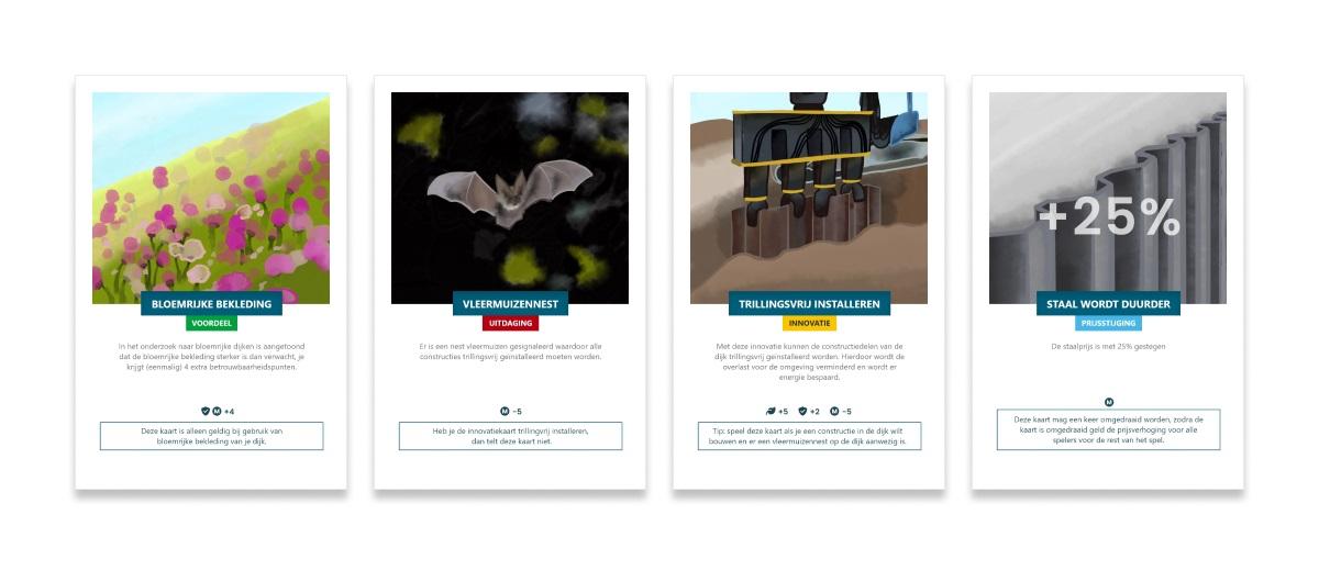 The cards confront players with innovations, challenges and benefits, such as vibration-free installation, archaeological finds and bat nests, floral revetments and price increases of building materials. The challenge is to make trade-offs between long-term and short-term effects, because solutions that are sustainable in the short term may not be so in the long term. Or vice versa.