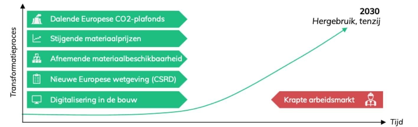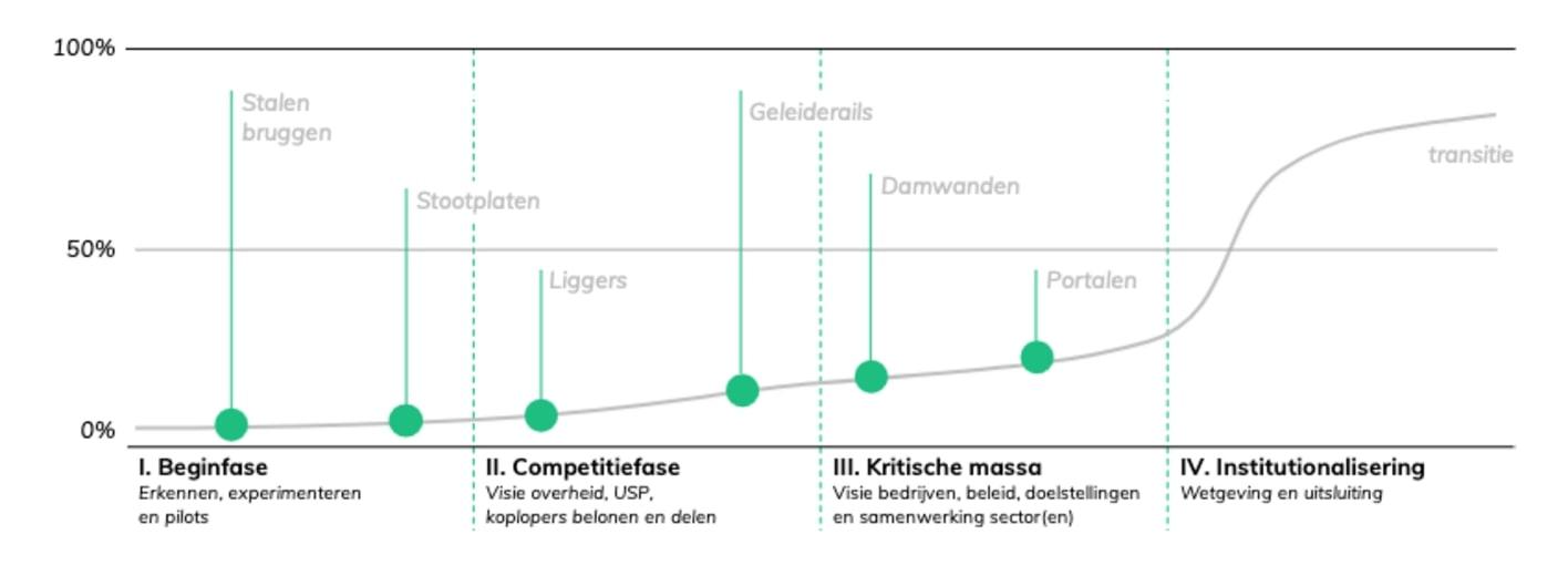 In addition to such technical and more pragmatic aspects, a market analysis was carried out for the seven object types. ‘In our analysis, we adopted the market transformation model (see schematic 02) as used at the Ministry of Infrastructure and Water Management,’ explains Sybren Bosch of Copper8. ‘We used this model to assess which transformation phase the market is in for each object type from the perspective of high-quality recycling. We see that the market dynamics for recycling are different for each object type. In some cases, a market already exists, such as for steel sheet piles, for example. These are relatively easy to redeploy elsewhere, although sometimes at a lower functional class, but there is a business case for recycling.’