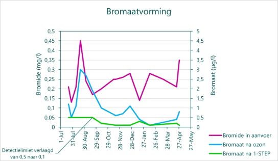 Last summer, we launched the long-term pilot test of the O3-STEP filter at WWTP Horstermeer of the Amstel, Gooi en Vecht Water Authority (link). The O3-STEP filter is an additional purification step in wastewater treatment and consists of a combination of ozonation (oxidation with ozone, O3) and filtration over a denitrifying granular activated carbon (GAK) filter (1-STEP®). One point of concern when using ozone is the conversion of bromide to the potentially carcinogenic substance bromate. However, measurements show that the concentration of bromate formed by ozonation decreases in the GAK filter.