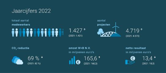 In 2022, consultancy and engineering firm Witteveen+Bos worked on over 4,700 projects in 50 countries. These efforts resulted in a revenue totalling EUR 165.6 million (2021: 160.3). Our net result was EUR 13.4 million (2021: 18.3) and our net profit margin was 8.1 % (2021: 11.4 %). This means that, financially, 2022 was a reasonably good year. The annual financial statements were officially adopted at the annual general meeting on Monday 17 April 2023.