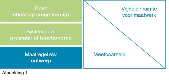 Maatwerk betekent dat ook een alternatieve invulling van een eis kan worden voorgesteld; een maatregel waarmee de doelstelling in gelijke mate wordt gehaald. Afbeelding 1 laat zien hoe de verschillende abstractieniveaus van doelen en eisen zich tot elkaar verhouden. Een meer algemene doelomschrijving geeft meer (creatieve) vrijheid en ruimte voor maatwerk. Een maatregelomschrijving is beter meetbaar, maar maakt maatwerk lastiger.