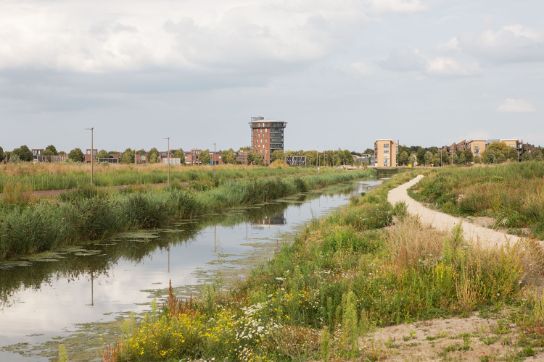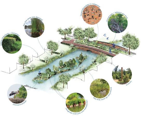 Witteveen+Bos is de spin in het web geweest bij het vertalen van de ambities van het Convenant Klimaatadaptief Bouwen naar gebiedsontwikkeling in de praktijk. ‘De uitgangspunten in het convenant zijn volgens de trechtermethode concreet gemaakt. De blauw/groene hoofdstructuur is verankerd in het bestemmingsplan. Hierbij is rekening gehouden met beleidsregels en MER-verplichtingen. De natuurinclusieve maatregelenmatrix bood en biedt belangrijke houvast bij de keuzes.’