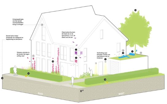 Net als het streven naar een sterke samenhang tussen het ontwerp van de openbare ruimte en de gebouwen. Dit is van cruciaal belang om écht natuurinclusief te ontwerpen. Dieren stoppen immers niet bij de kavelgrens, maar bewegen zich vrij tussen openbare ruimte, tuinen en gebouwen.