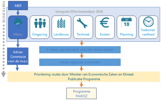 De Omgevingswet schrijft bij een project van dergelijke omvang een planMER voor. Dit is een milieueffectrapport waarin de milieugevolgen van het project systematisch, transparant en objectief in beeld worden gebracht. Ook worden hierin maatregelen beschreven om negatieve gevolgen op het milieu te voorkomen of te beperken. Er wordt echter breder gekeken dan naar milieu alleen. In de door W+B en RHDHV op te stellen Integrale Effect Analyse (IEA) worden de routes ook beoordeeld op andere thema’s (zie afbeelding).