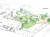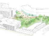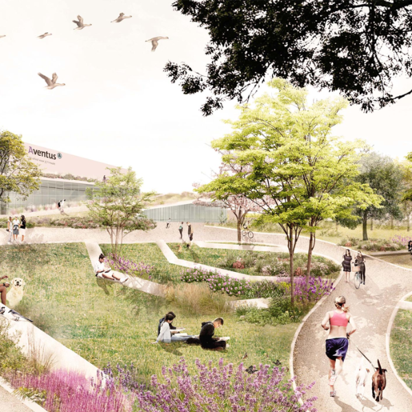 Aventus is located on the eastern edge of the City Campus and borders directly on a residential area. The P+R grounds are now located between the railway and the current Aventus and Saxion building. This site currently forms a backdrop to the buildings on Handelskade. The new development of the P+R grounds will transform the paved large-scale car park into a green car-free courtyard. The quality of the existing undulating green zone next to the current Aventus building will be enhanced and will form an integral part of the green courtyard.