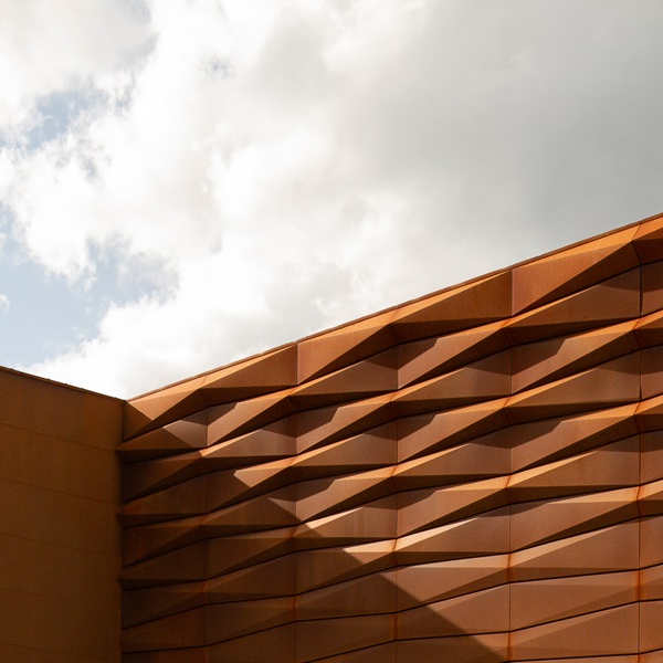 The weathering steel sculpture and the green façades simultaneously refer to the two historical landscapes of area: the higher lying fields of the Beiler Es with variable tones of reddish brown and the lower lying green river valley. The 3D pattern of the weathering steel façade panels also depicts the relief of a water surface.