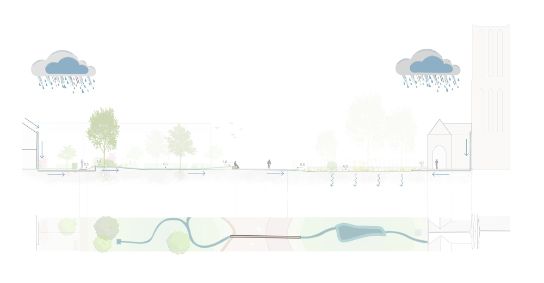 The roofs of the surrounding buildings will also be disconnected from the sewer system. Rainwater will be channelled to the central wadi via surface flows. The wadi specifically serves a double function: for water storage to unburden the sewer system during peak downpours, and it also serves as an aesthetic, spatial and recreative element. For example, this is reflected in the inclusion of a stone walking path in the design. In addition to the Multifunctional Design principle, the Nature-based Design principle also has prominence. In part because the rainwater is slowly infiltrated into the soil due to the landscaped gully.