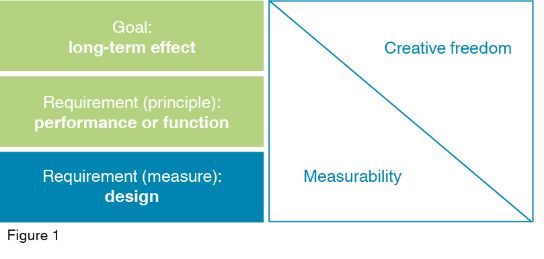 With space for customisation being afforded, alternative interpretations of a requirement – different measures which equally effectively help achieve a goal – become possible. Figure 1 shows how the different levels of abstraction formed by goals and requirements are related to one another. By defining general goals, greater freedom (for creativity) and space for customisation is created. Although defining measures can make it easier to assess their achievement, it generally makes customisation more difficult.