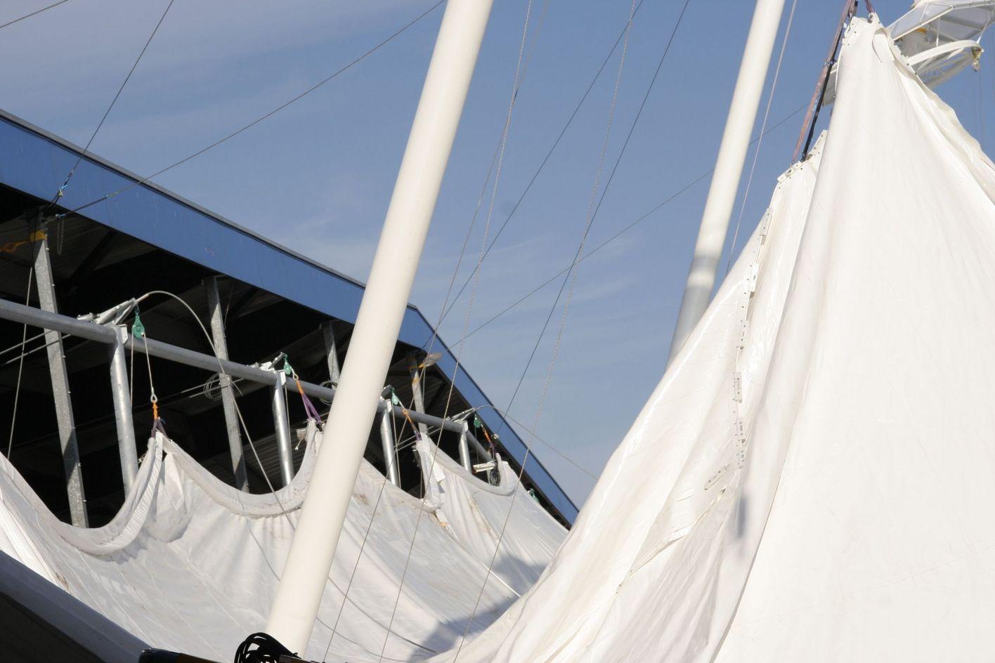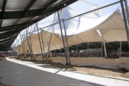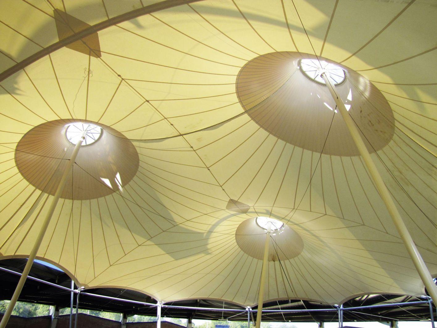 The membrane roof is strung under the edge of the existing roof rather than above it. The wind load was the key criterion for the design of the light membrane roof. Therefore, a 3D printed model was analysed in wind tunnel testing to obtain realistic wind load values that could be used to optimise results.