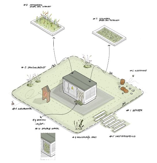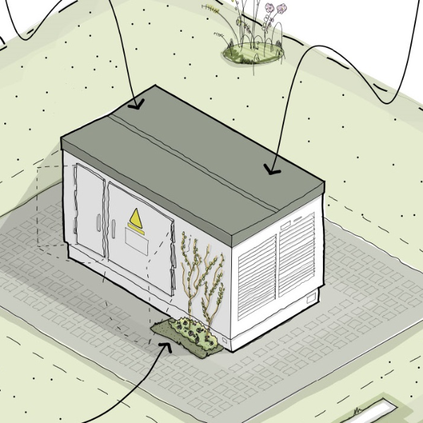 The negative effect of transformer substations and low-voltage substations on nature can be avoided in the future. They may even become places where nature can return and flourish, or they may act as a connection between natural elements.