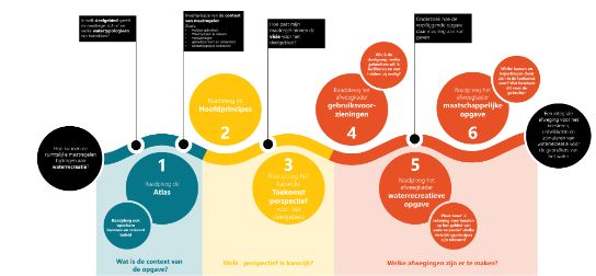 Following the steps in future spatial developments will facilitate informed assessments to be made to ensure the quality of Frisian water recreation for generations to come. The colours in the diagram correspond to the different parts of the vision. The atlas is shown in blue, the main principles and perspectives in yellow, while the assessment framework is coloured in orange-red.