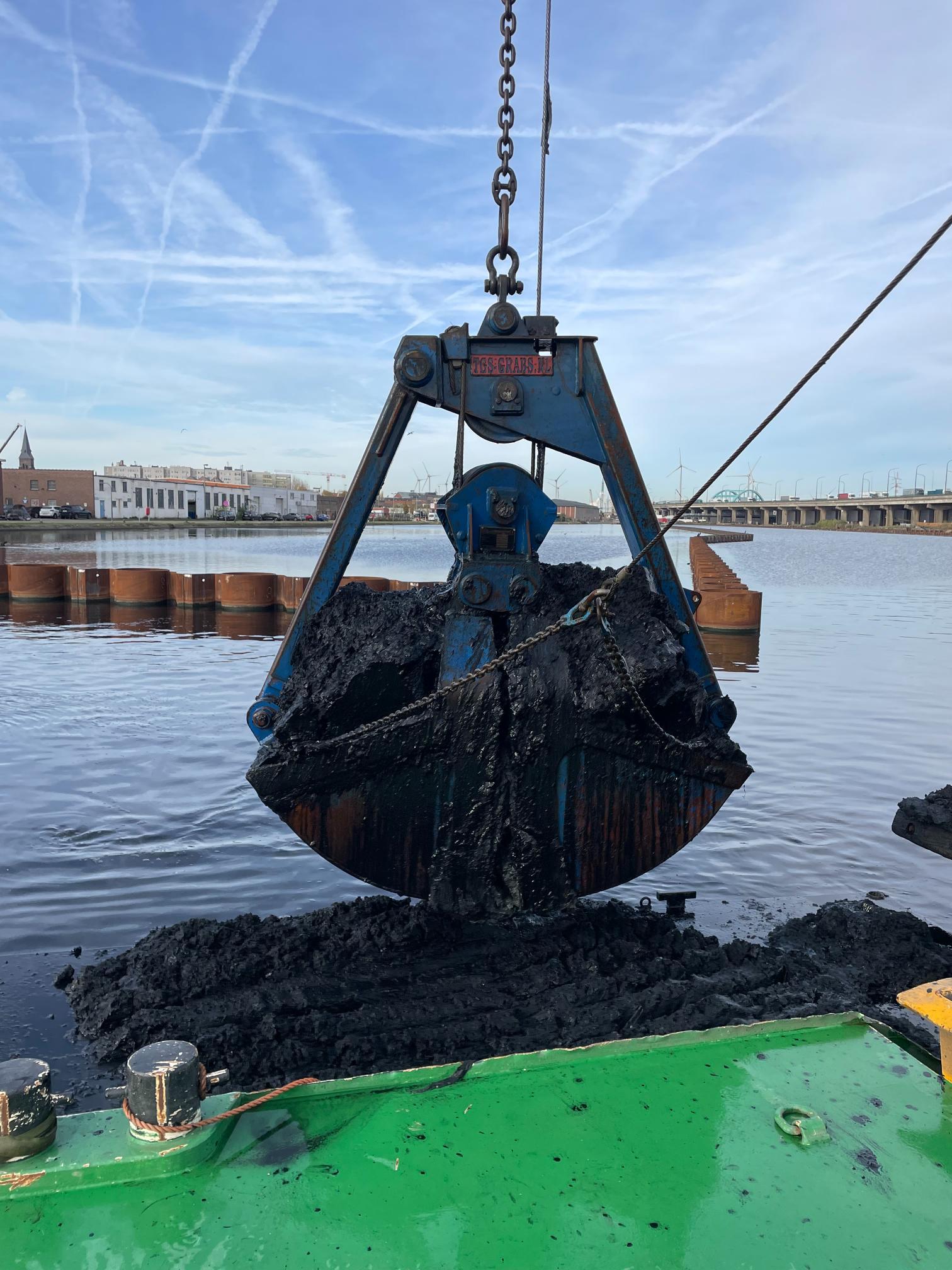 During Witteveen+Bos’ supervision of the remediation of the Lobroekdok in Antwerp for the parameters included in the Standard Analysis Package (mineral oil, PAHs and heavy metals) between May 2017 and August 2019, highly water-rich sludge was removed during dredging. During dewatering, this sludge proved to contain high concentrations of PFAS compounds.