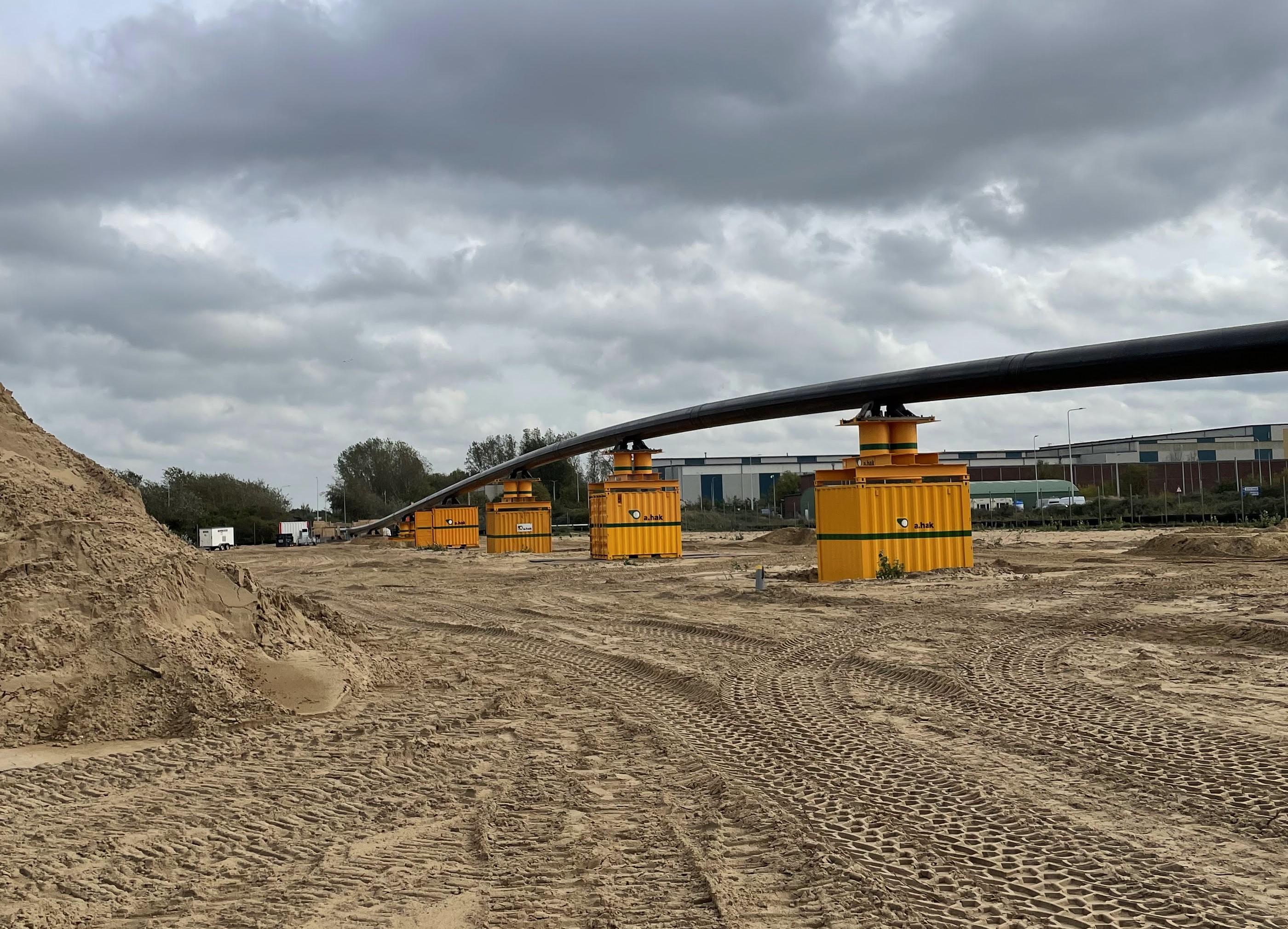 The transport pipeline is brought to the construction site in sections and welded together on location. The hole is then bored and the pipeline is pulled through the hole in a single operation. This process must proceed quickly, due to the risk of collapse of the hole. The pipeline must be installed in the correct subsurface layer – at a depth of 15 metres – to minimise the risk of ground heave.