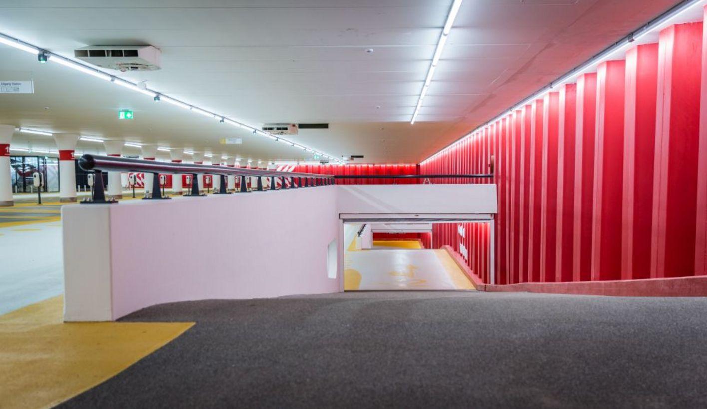 A great deal of attention has also been paid to the aesthetic aspect. The ceiling of the car park is completely flat because all structural beams, air ducts and lighting cables have been skilfully concealed. This creates a calm, high-quality appearance and prevents visual noise. As a result, visitors' attention is focused entirely on the clear signage and inviting entrances, which contributes to a positive parking experience.