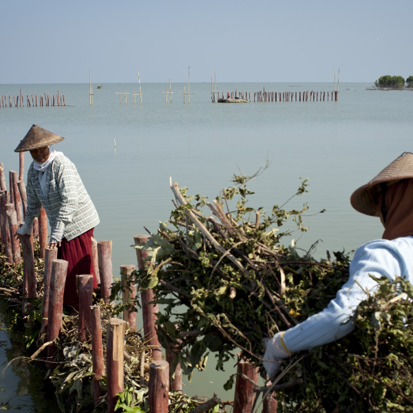 In the past few decades large parts of the mangrove forests on the north coast of Java have been cut down to make way for fish ponds or because of infrastructure or groundwater developments. This has led to extensive erosion as the coast is no longer naturally protected by the mangroves. Roads, schools, homes and fish ponds have all been lost to the sea and many residents no longer have a source of income. Artificial coastal protection has turned out to be expensive, ineffective and not climate-adaptive.