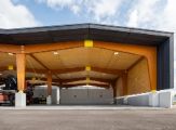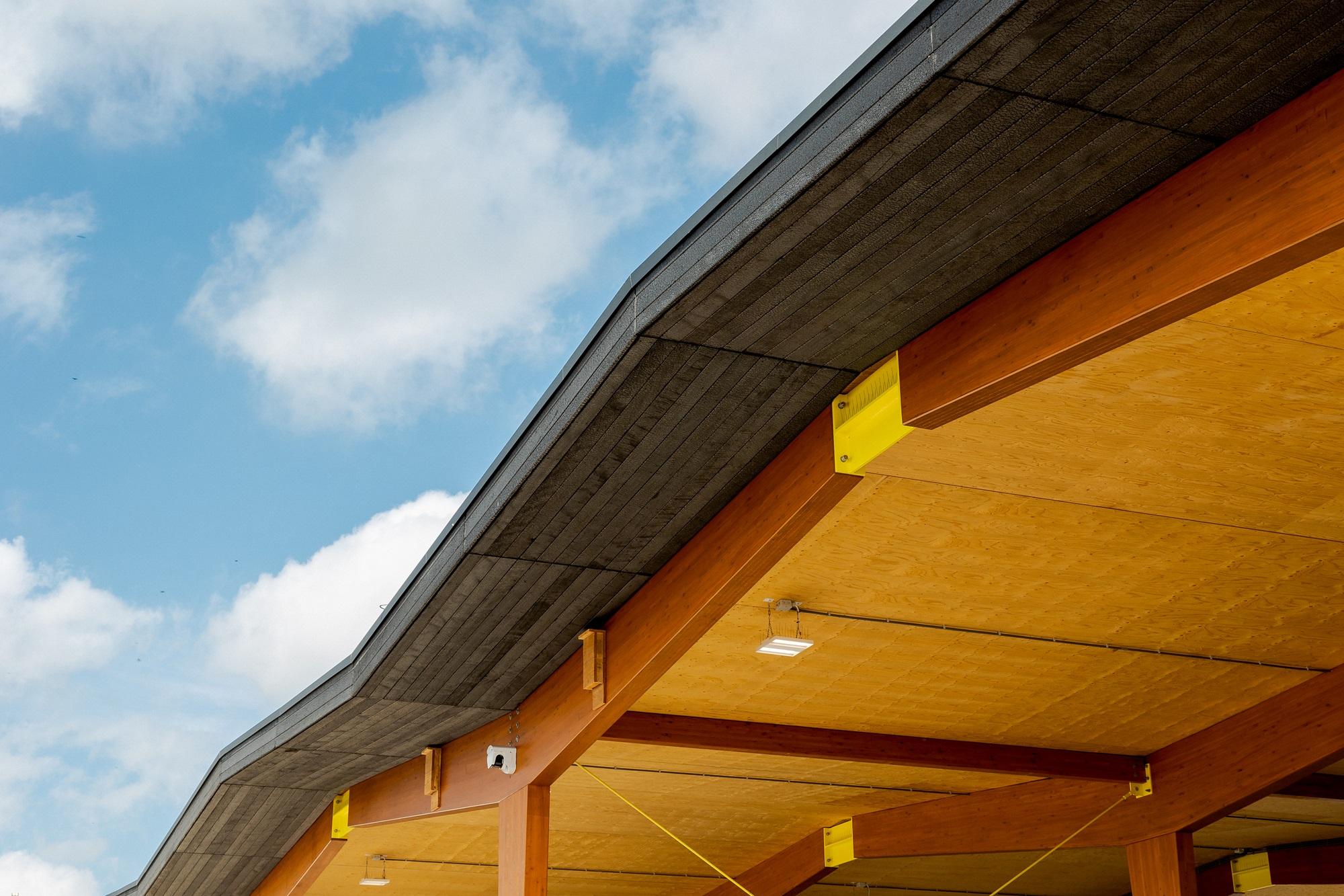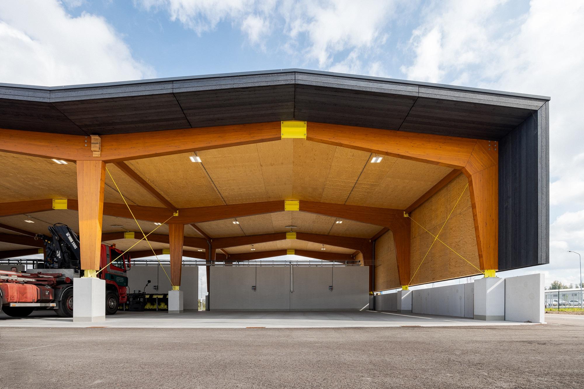 The sustainable wooden construction consists of modular T-shaped larch trusses. These are used in both the storage building and the salt sheds, which optimises the reusability of the element. The difference in headroom between the two buildings is compensated for by the height of the concrete footings. The iconic wooden trusses give the maintenance depot cohesion and character.