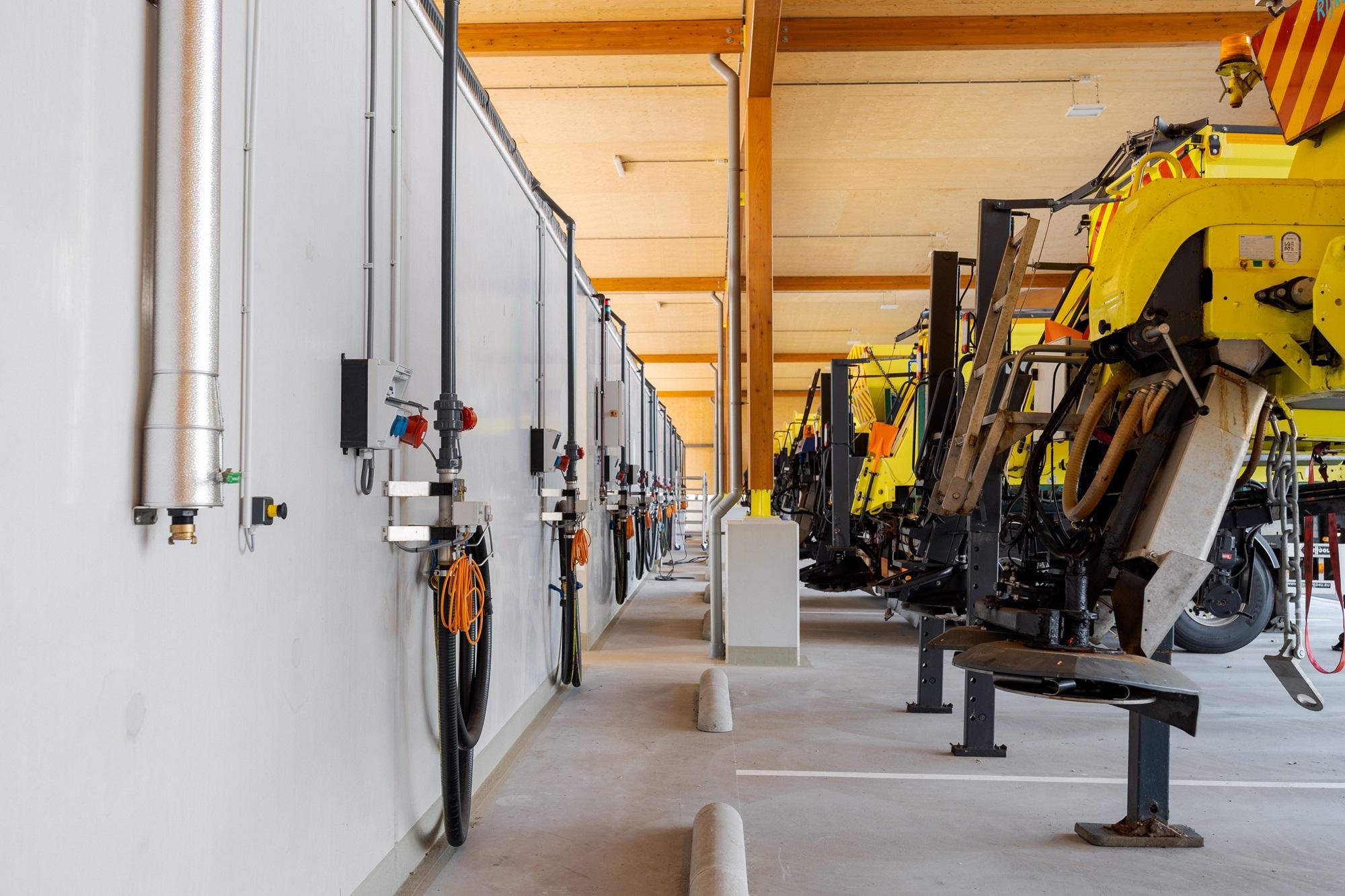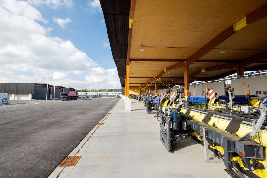 The service building, storage building and salt shed are positioned in such a way as to optimally facilitate the work process. In the interests of safety and efficiency, the routing has no crossing movements and there is maximum visibility of buildings and grounds. This includes the entrance and exit from the service building.
