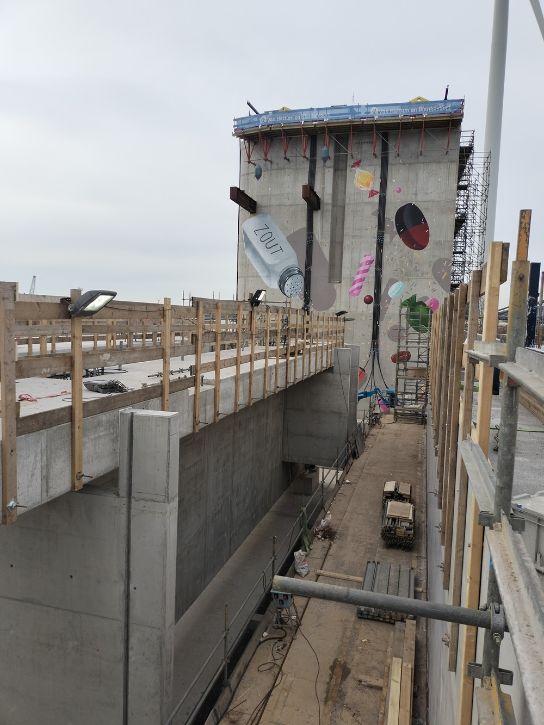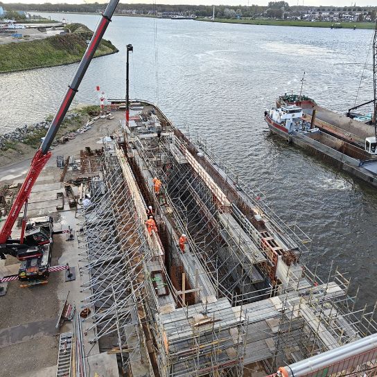 In October 2022, following preparatory work, the contractor started construction of the salt dam. In March 2024, the 27-metre-high pillars were installed in the deepened canal. The pillars were hoisted into place by Europe’s second-largest crane vessel, the Gulliver. In the summer of 2024, large concrete walls will be mounted to the pillars, and abutments and a pocket door will be installed in the pillars’ upper part. The salt dam is expected to be operational by the end of 2024.