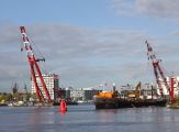 The soil below the station’s newly installed ‘floor’ was excavated, and the old wooden piles were removed. After the trench below the station had been connected to the three tunnel sections immersed in the IJ river, the fourth tunnel section was transported by ship to the trench below the station and immersed. The river’s water level was temporarily lowered for this purpose.