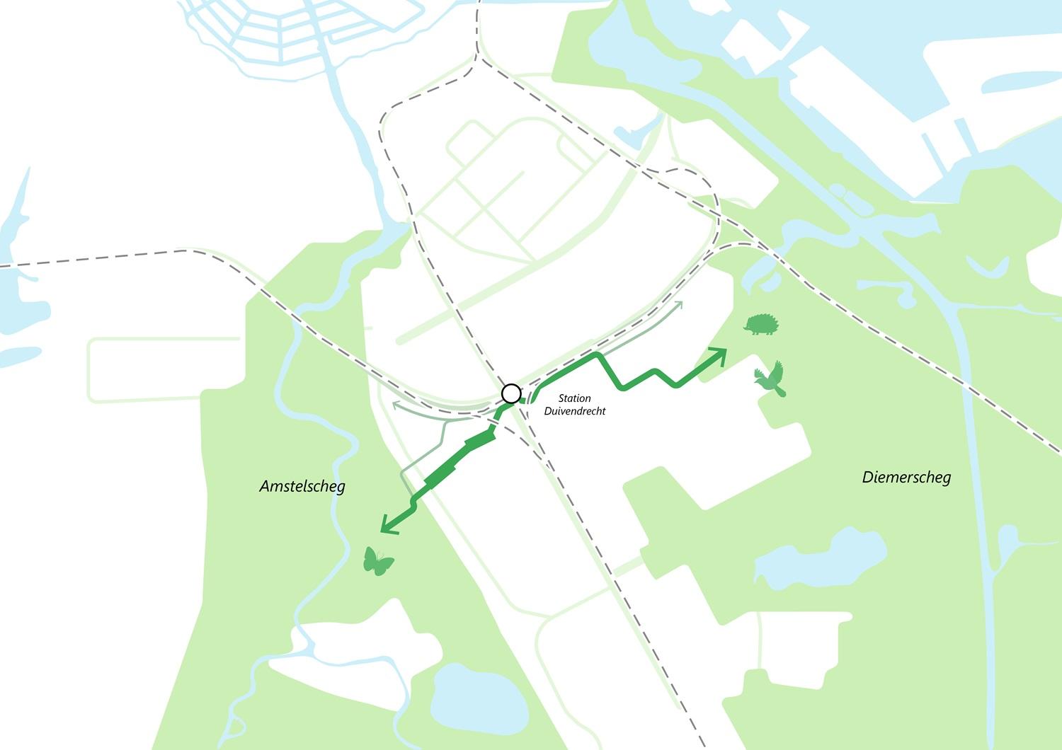 Strategically placed trees, green sightlines and clear landmarks make the station a green oasis and a pleasant transfer point in an urbanised environment. By robustly connecting the currently separate green wedges, eco-passages are created that provide living space for many animal species. This combination creates an attractive entrance at ground level, facilitates many ´walkers and cyclists´ in ´De Nieuwe Kern´ and stimulates biodiversity.