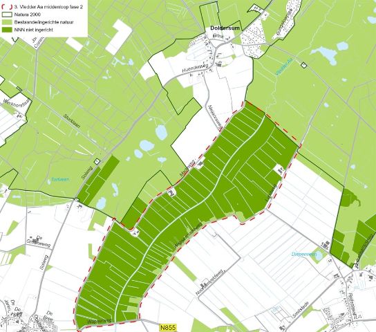 Caption: The project area of the Vledder Aa stream valley is surrounded by the villages of Vledder, Doldersum and Wapse. The Drents-Friese Wold National Park and the hamlet of Oude Willem lie to the north and east. The hamlet of Boschoord lies to the northwest.
